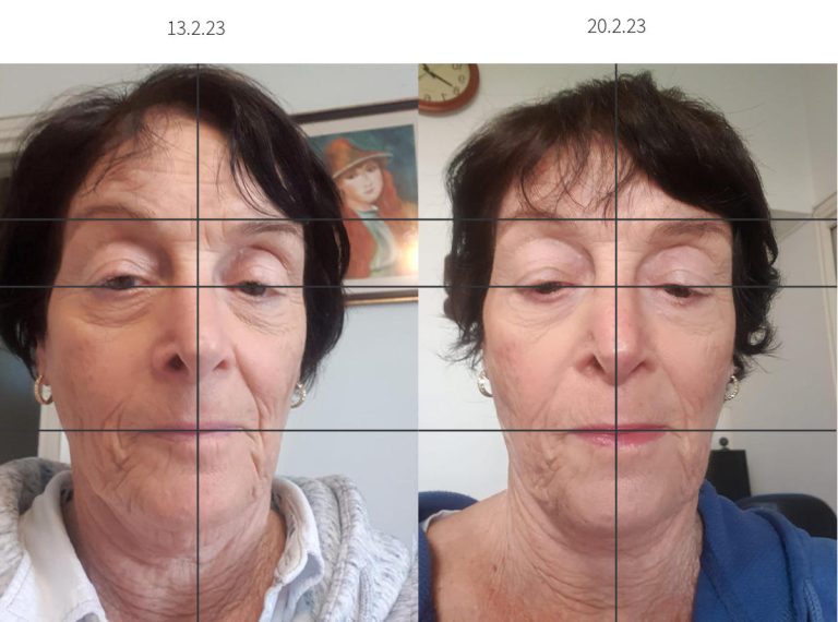התחלנו את השיעור עם תמונה של לאה, ששלחה מעקב לאחר שבוע של תירגול השיעור הקודם (כיפוי, הרגעה, קמטים לצידי האף). אפשר לראות בתמונה איך אחרי שבוע יש שינוי בעומק הקמטים לצידי האף, מרגש ביותר. התמונה מצורפת מתחת לסרטון.